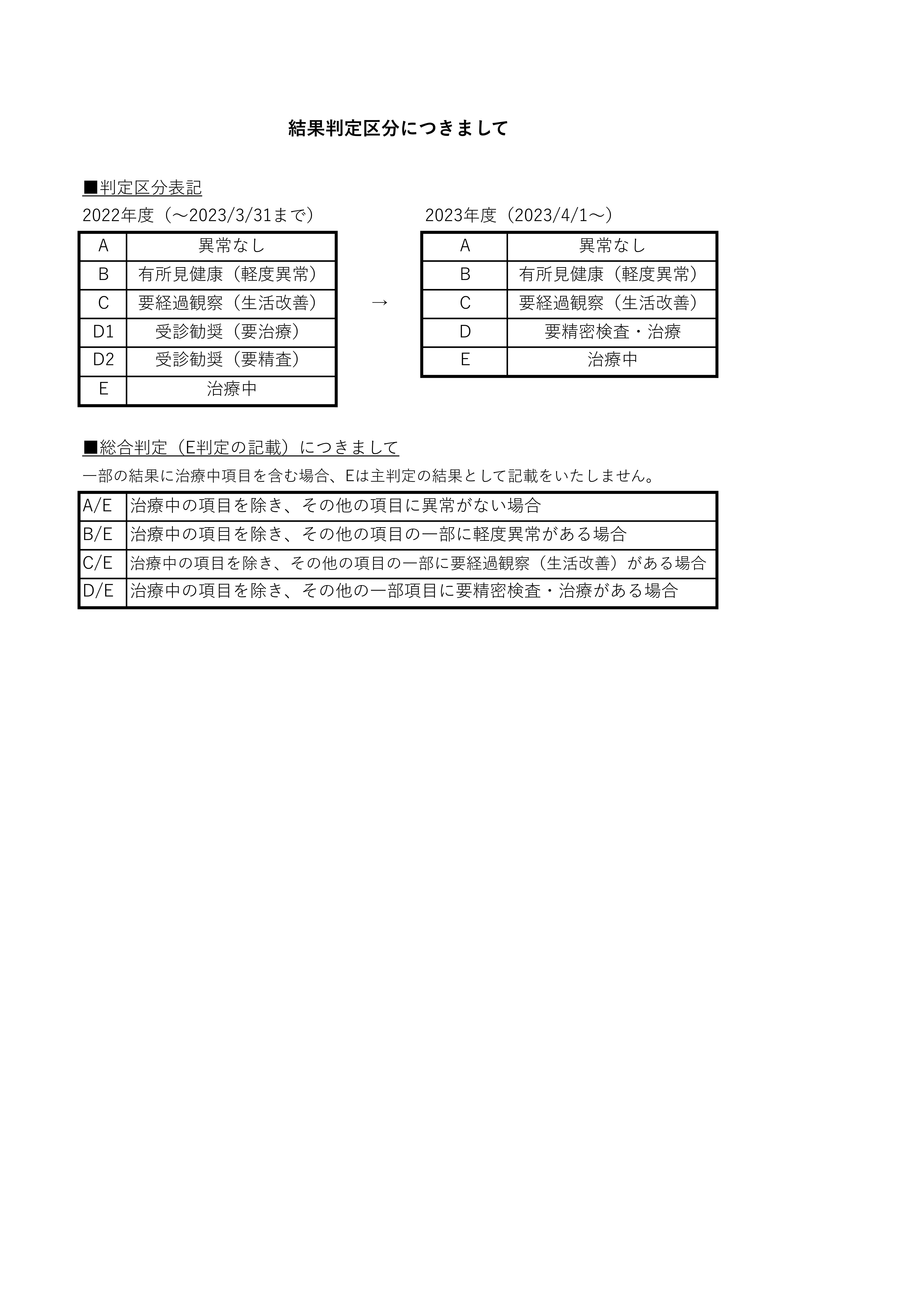 平素より、医療法人知音会四条烏丸クリニックをご利用いただき、誠にありがとうございます。 2023年4月1日ご受診分より下記の通り総合判定結果の記載を変更いたします。